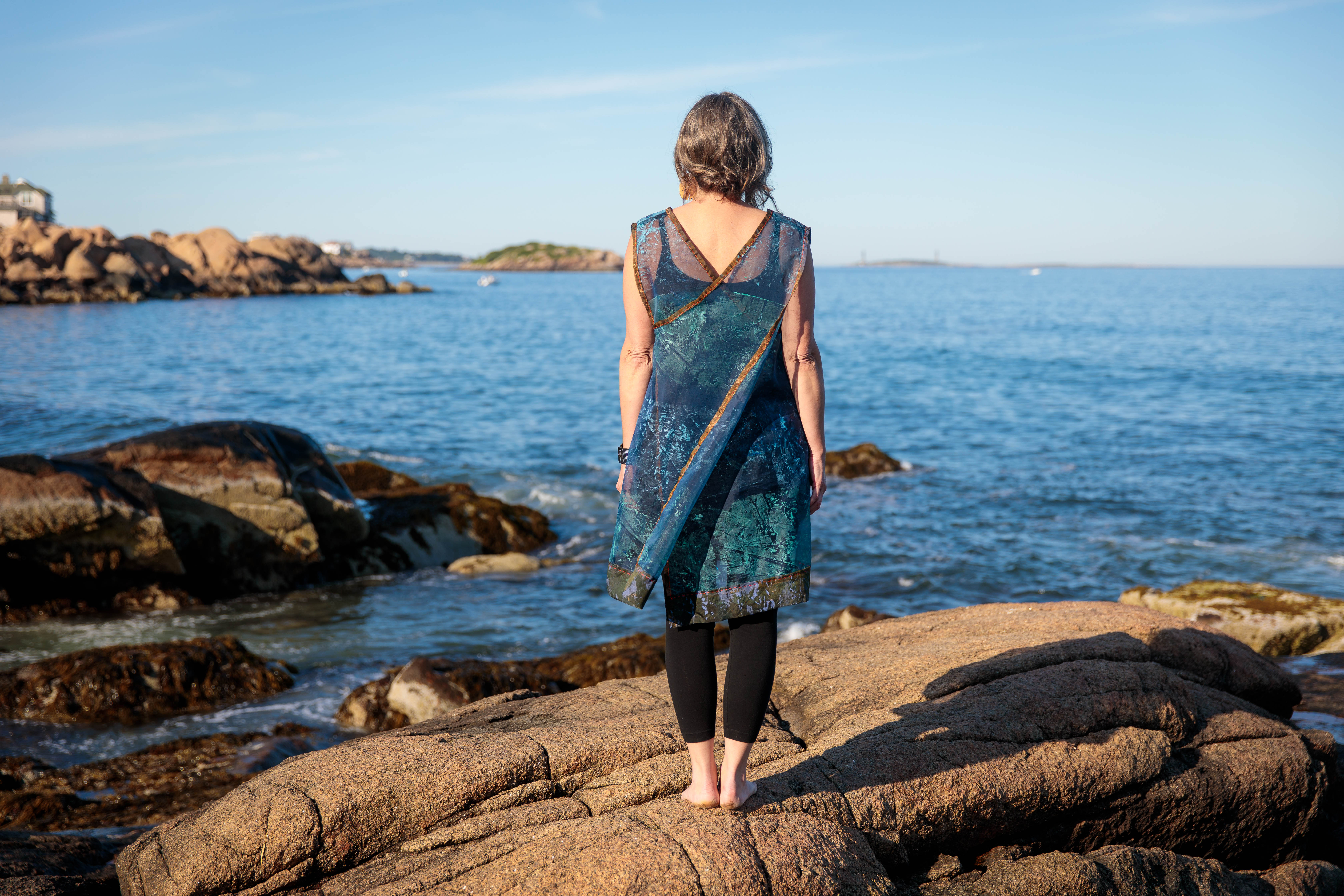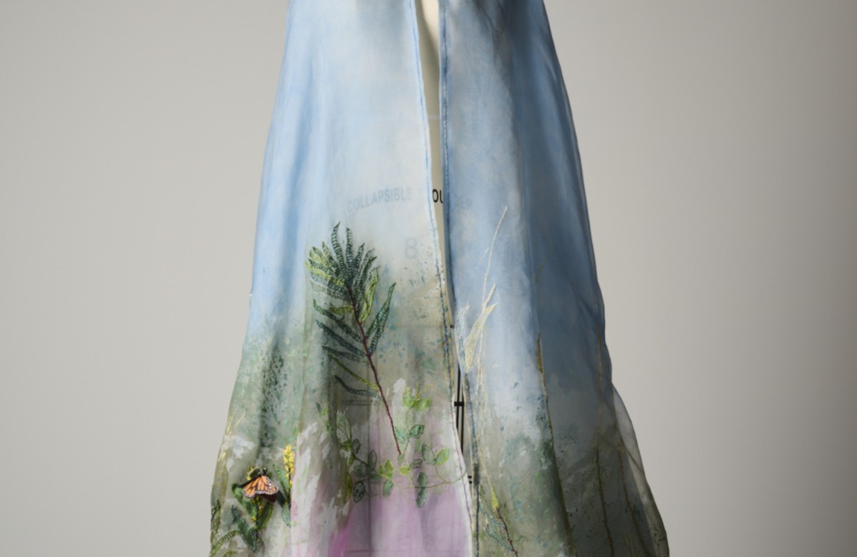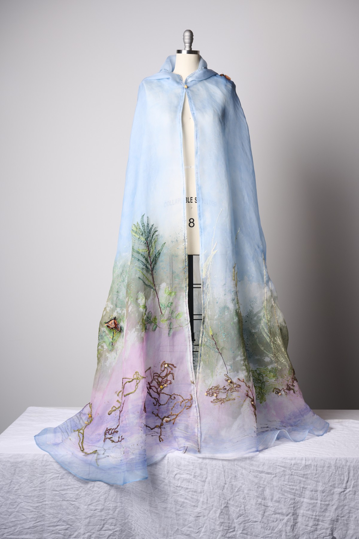 The Migration Cloak is a hand-sewn, printed, and embroidered silk organza cloak. It features shell beads and removable silk Monarch Butterflies. This piece captures the sweep, the light, and the colors of a red sand pocket beach in Phippsburg, Maine during the fall migration.