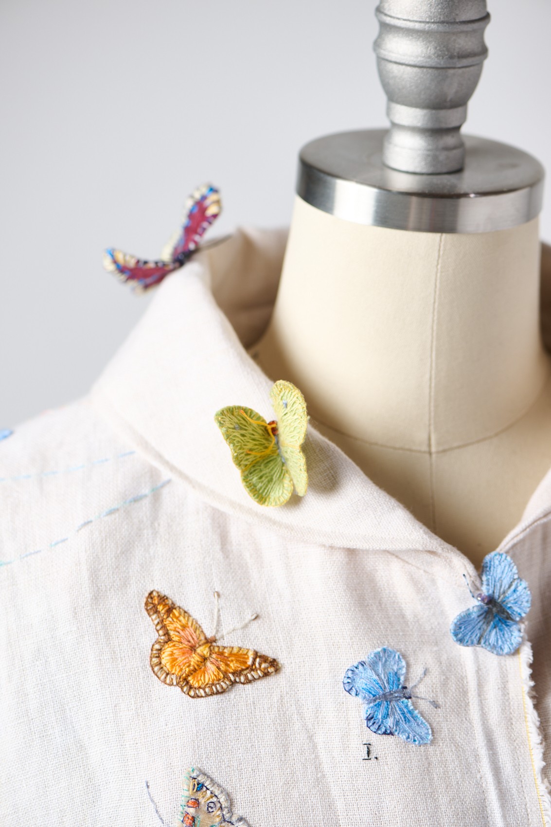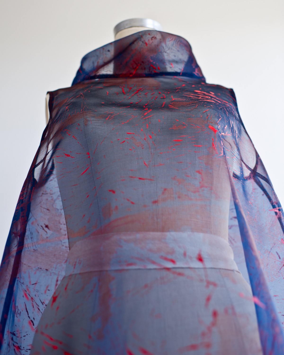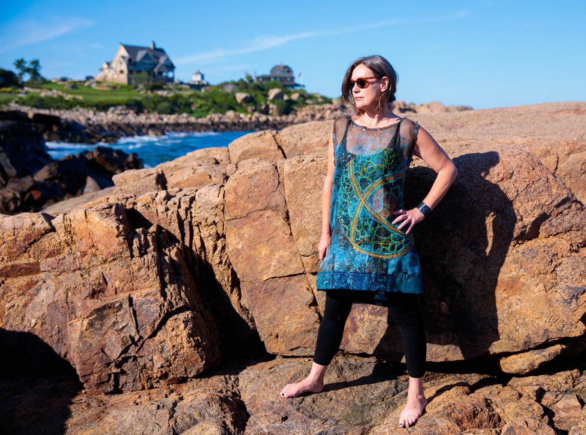 The Migration Cloak is a hand-sewn, printed, and embroidered silk organza cloak. It features shell beads and removable silk Monarch Butterflies. This piece captures the sweep, the light, and the colors of a red sand pocket beach in Phippsburg, Maine during the fall migration.