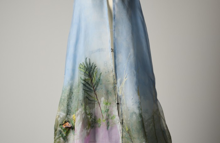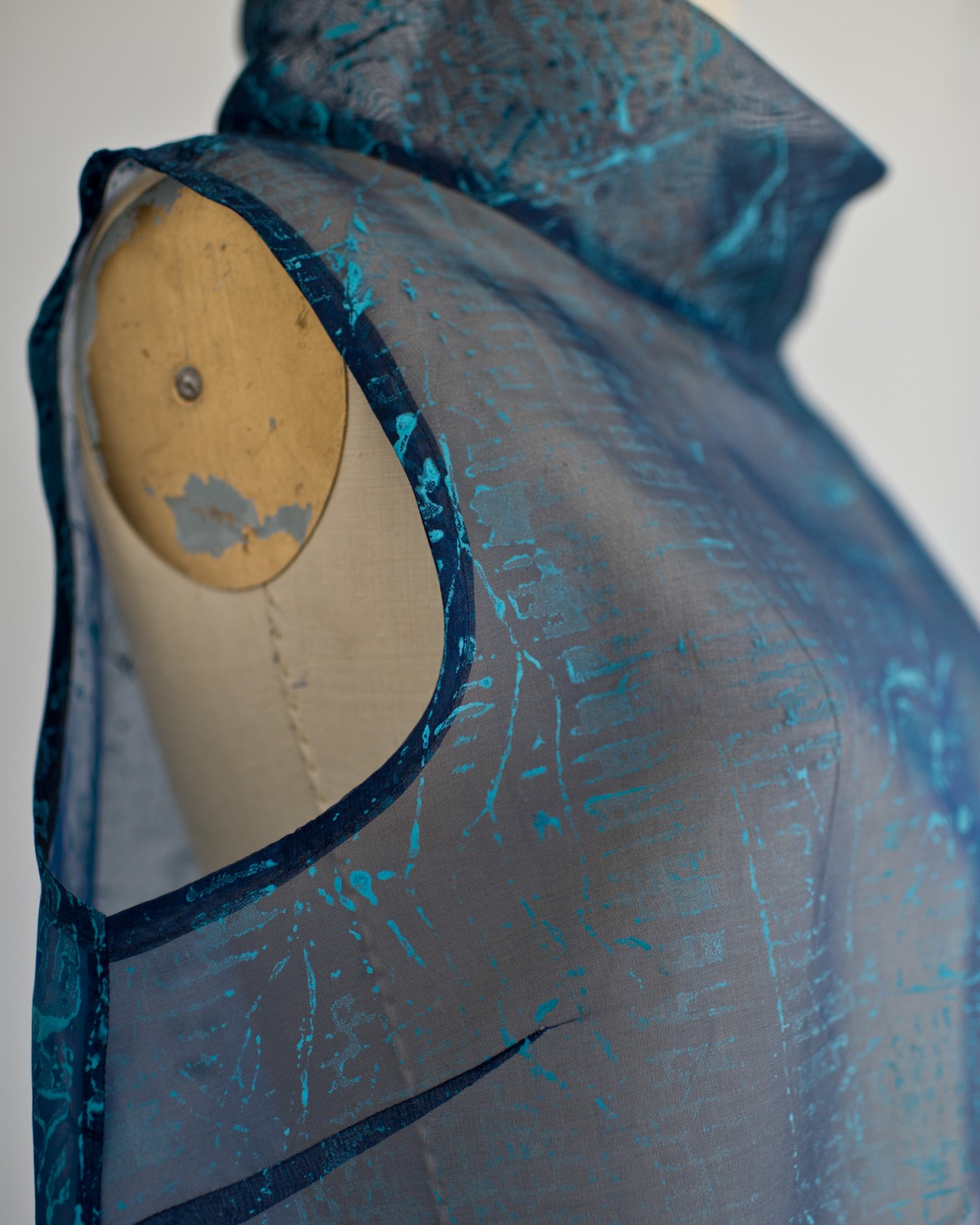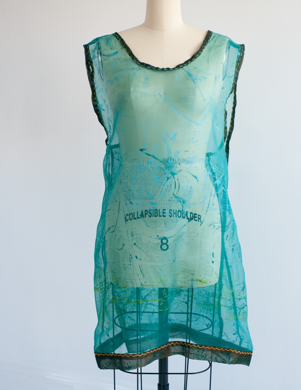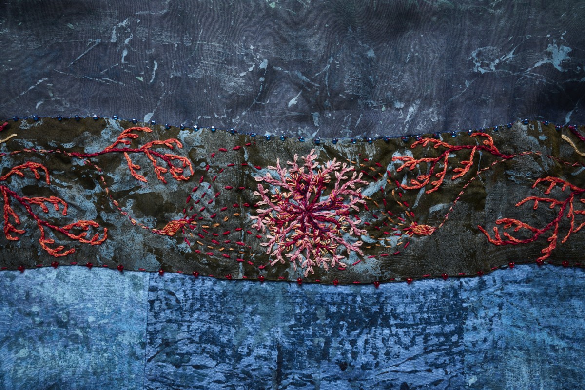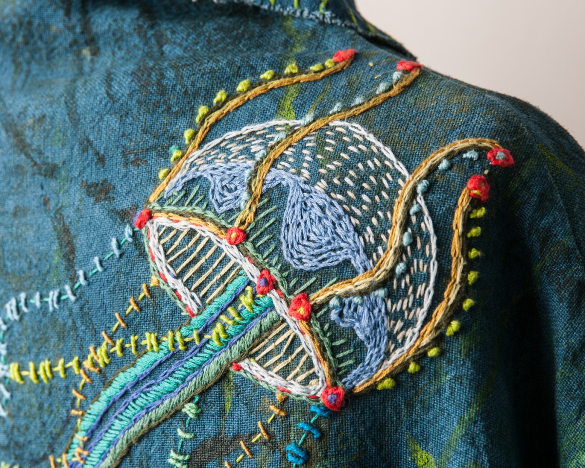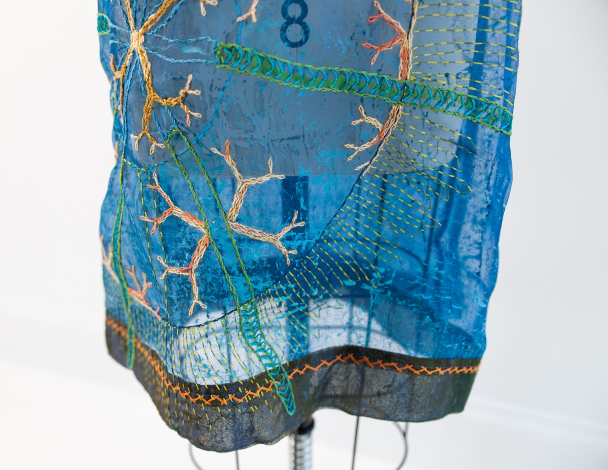 A series of dresses, coats, and Japanese aprons made of silk organza and linen. Hand-dyed and hand-printed with seaweed plates. Embroidered with images of marine life, both microscopic and actual size.