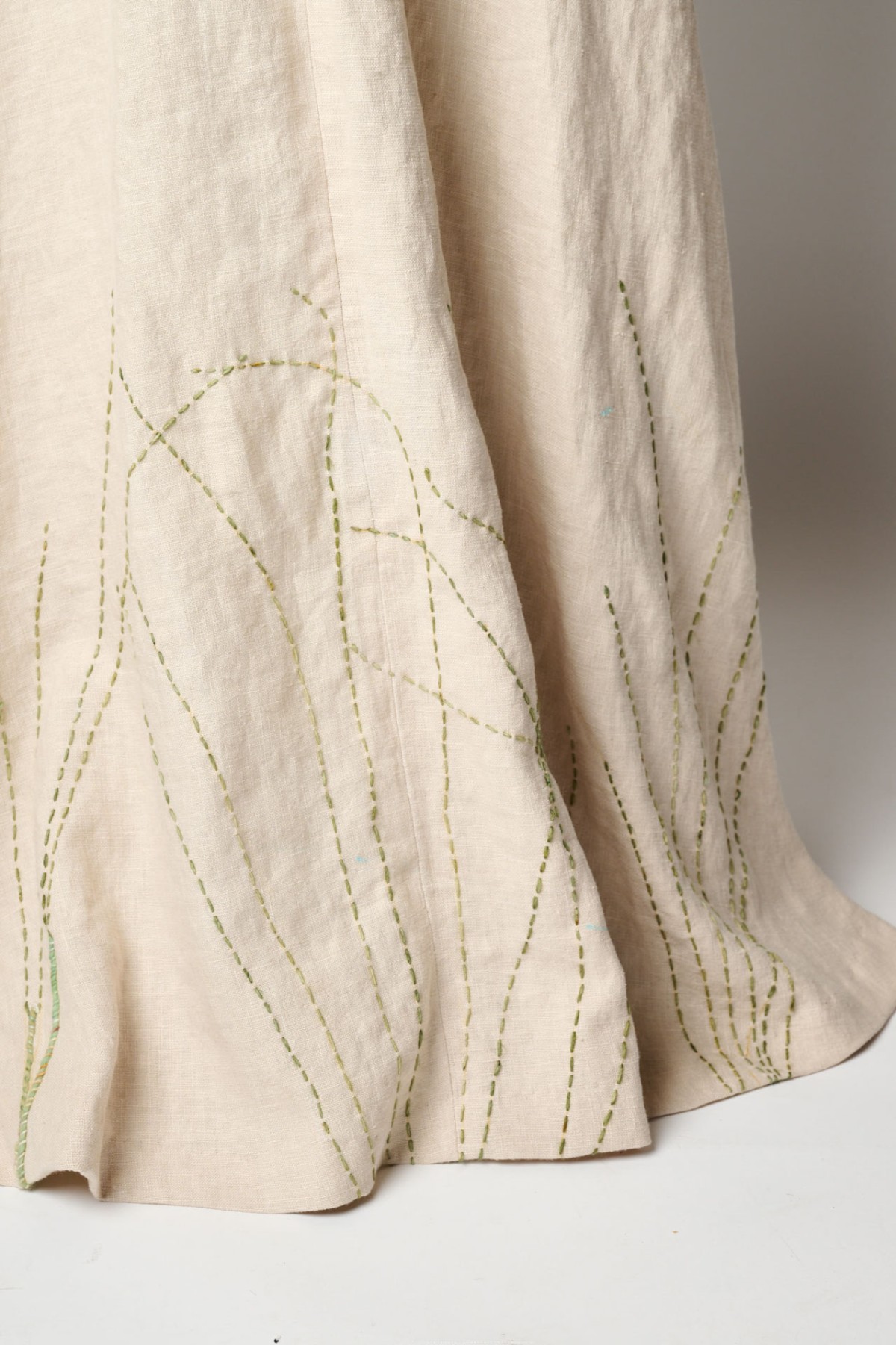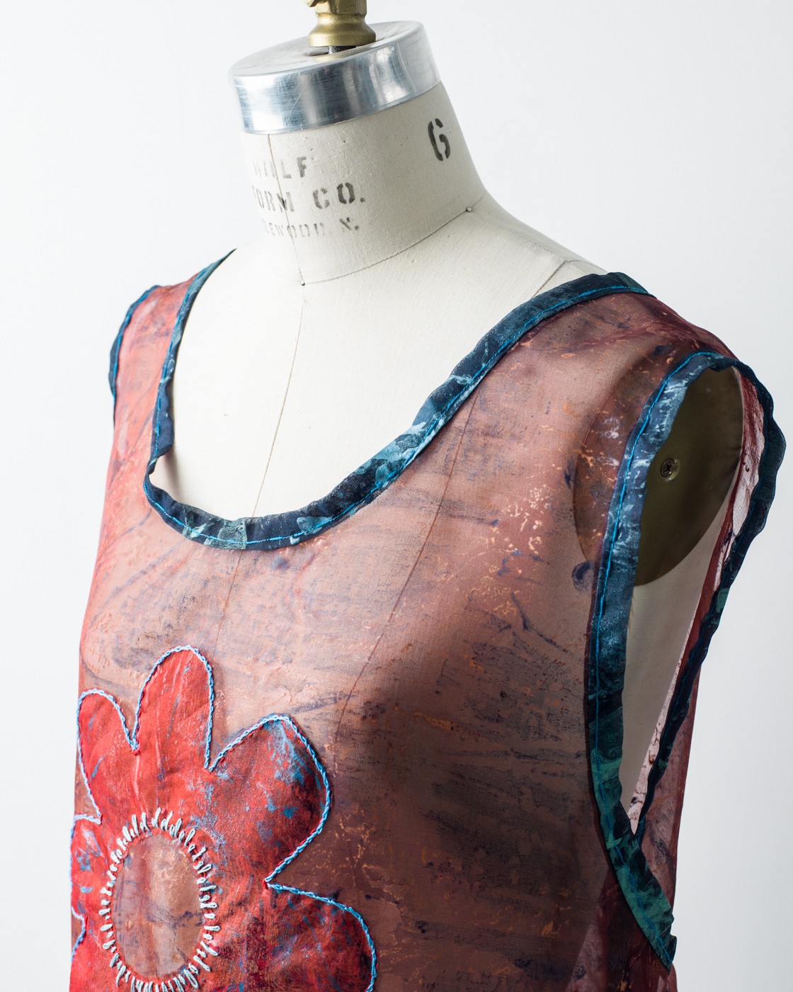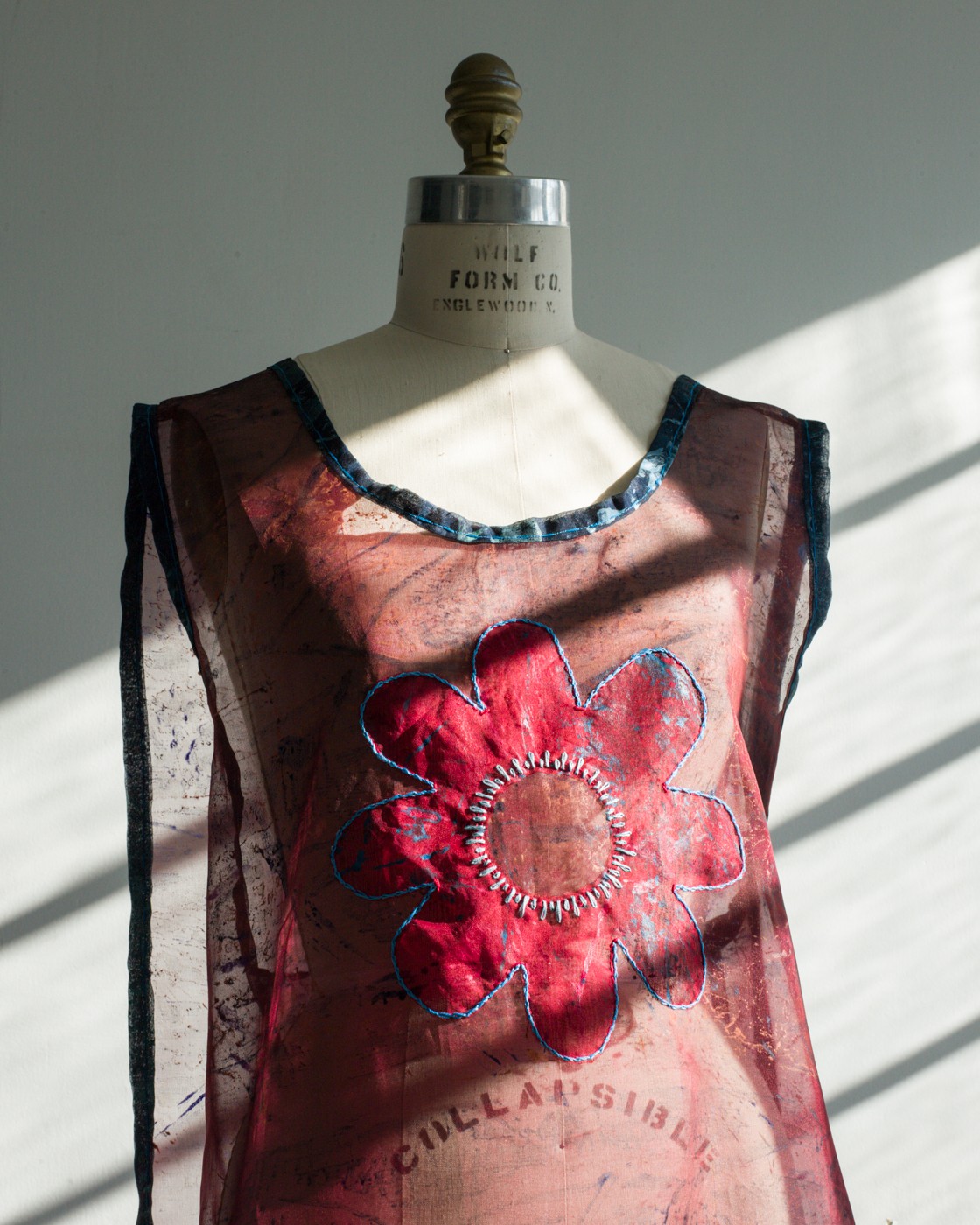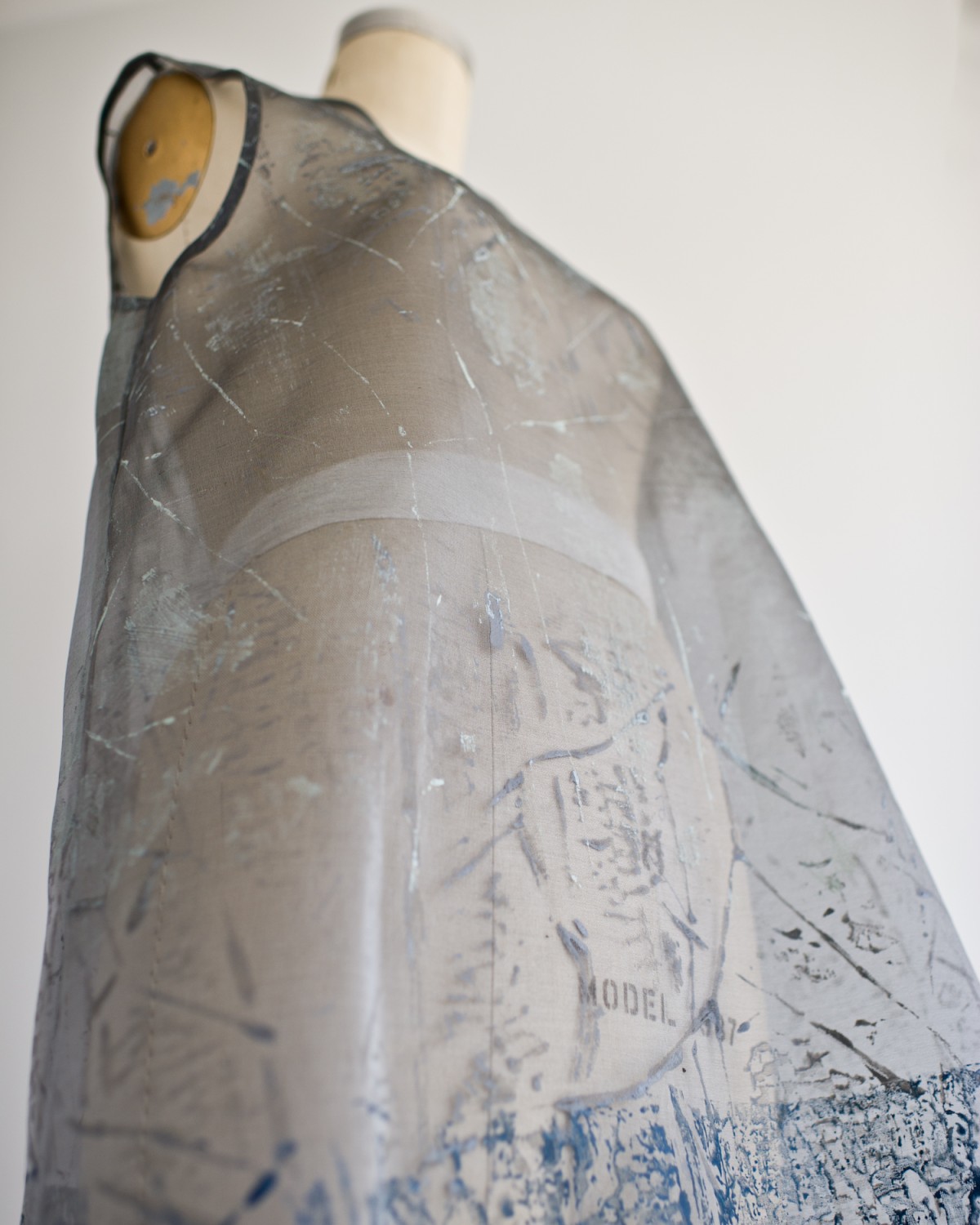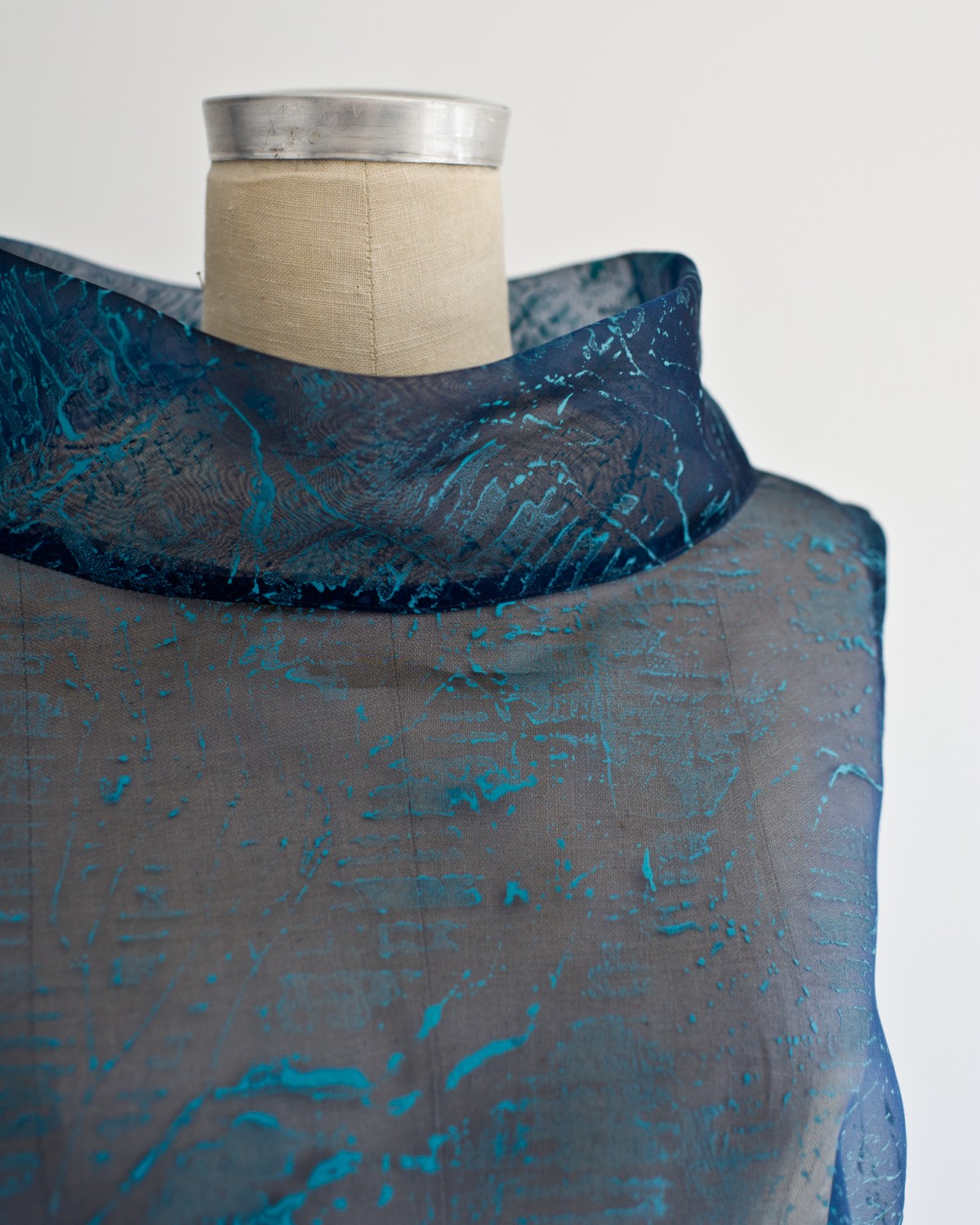 A series of dresses, coats, and Japanese aprons made of silk organza and linen. Hand-dyed and hand-printed with seaweed plates. Embroidered with images of marine life, both microscopic and actual size.