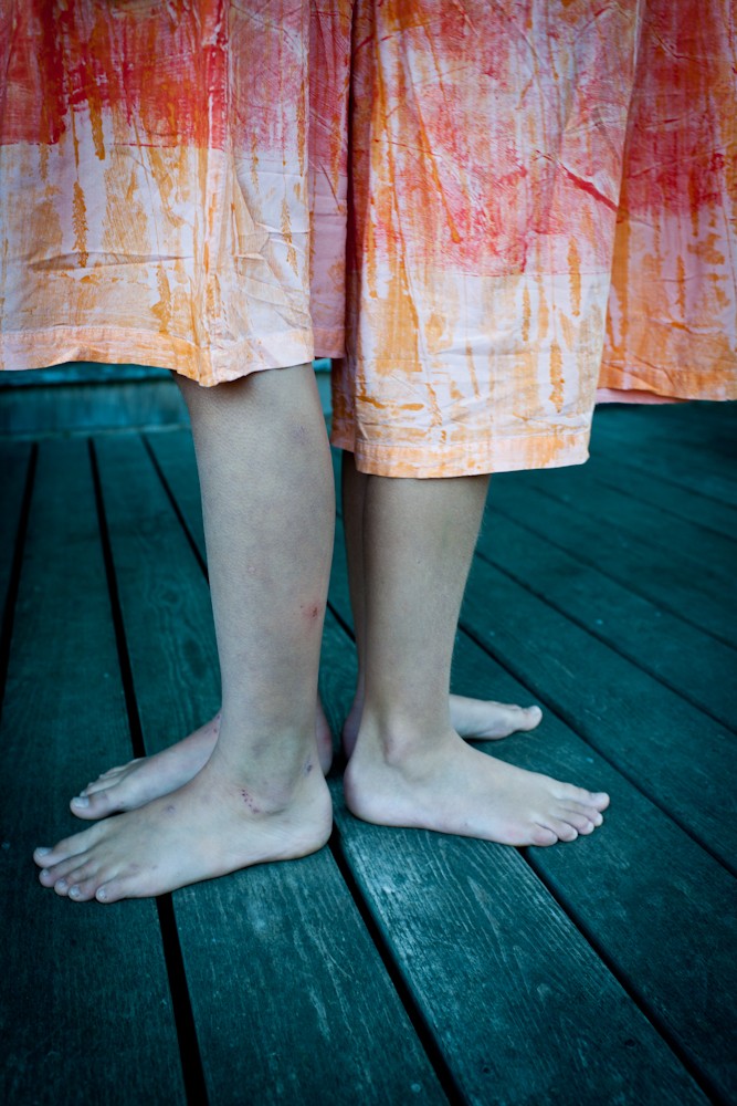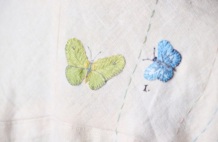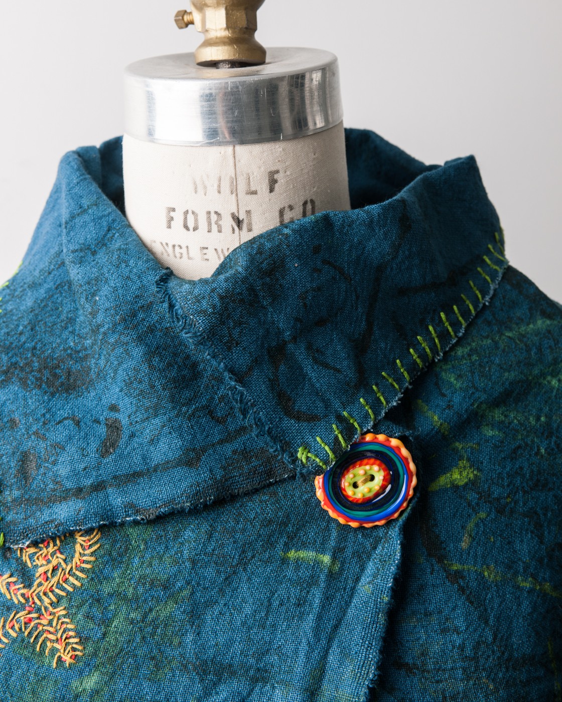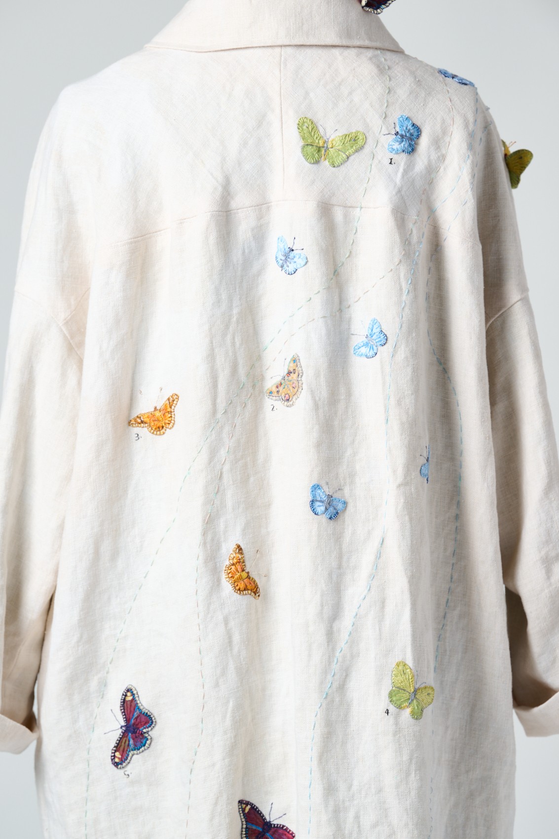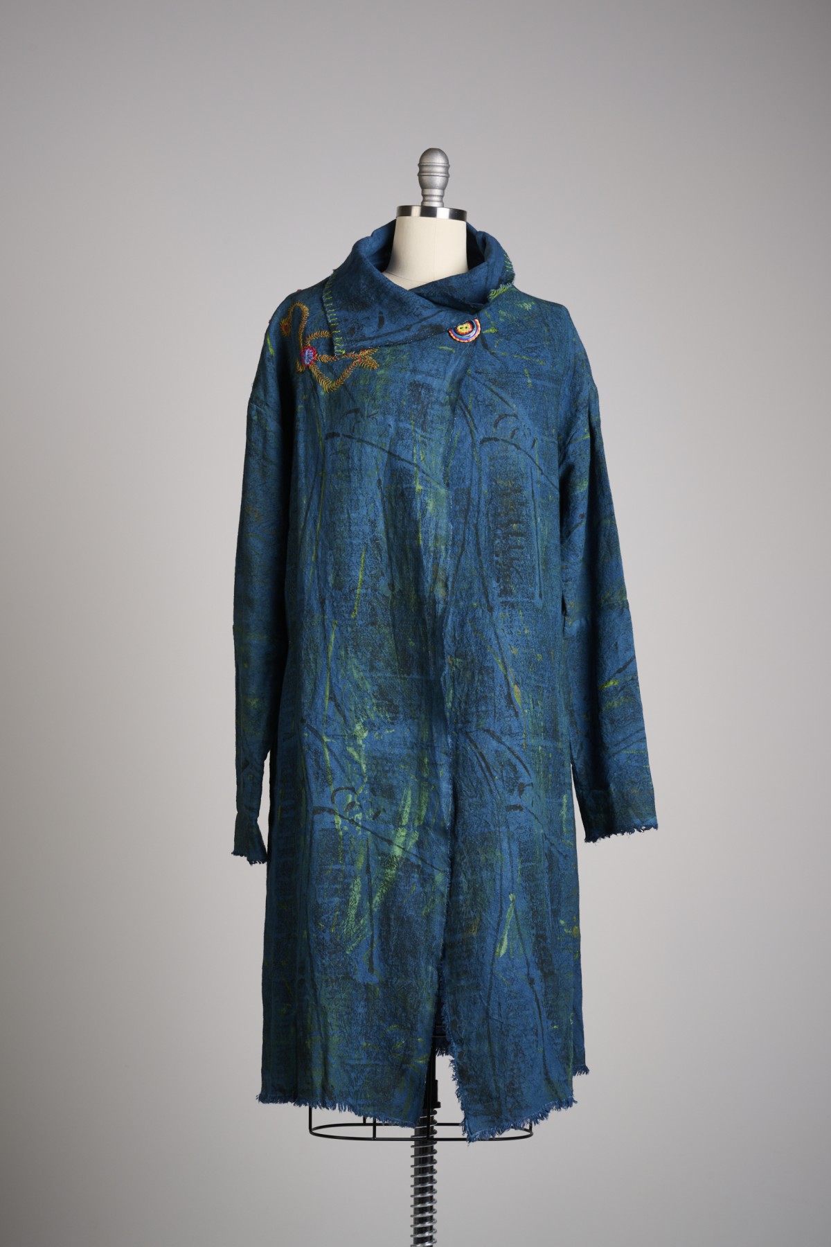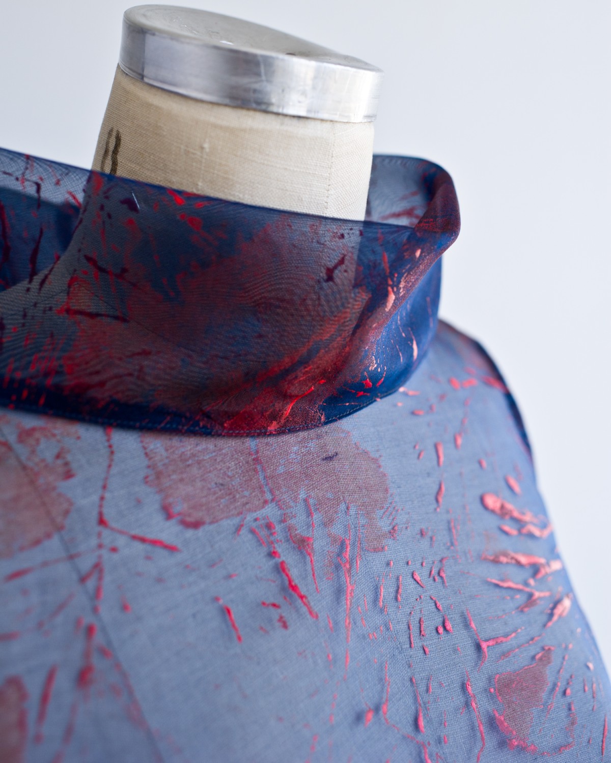 A series of dresses, coats, and Japanese aprons made of silk organza and linen. Hand-dyed and hand-printed with seaweed plates. Embroidered with images of marine life, both microscopic and actual size.