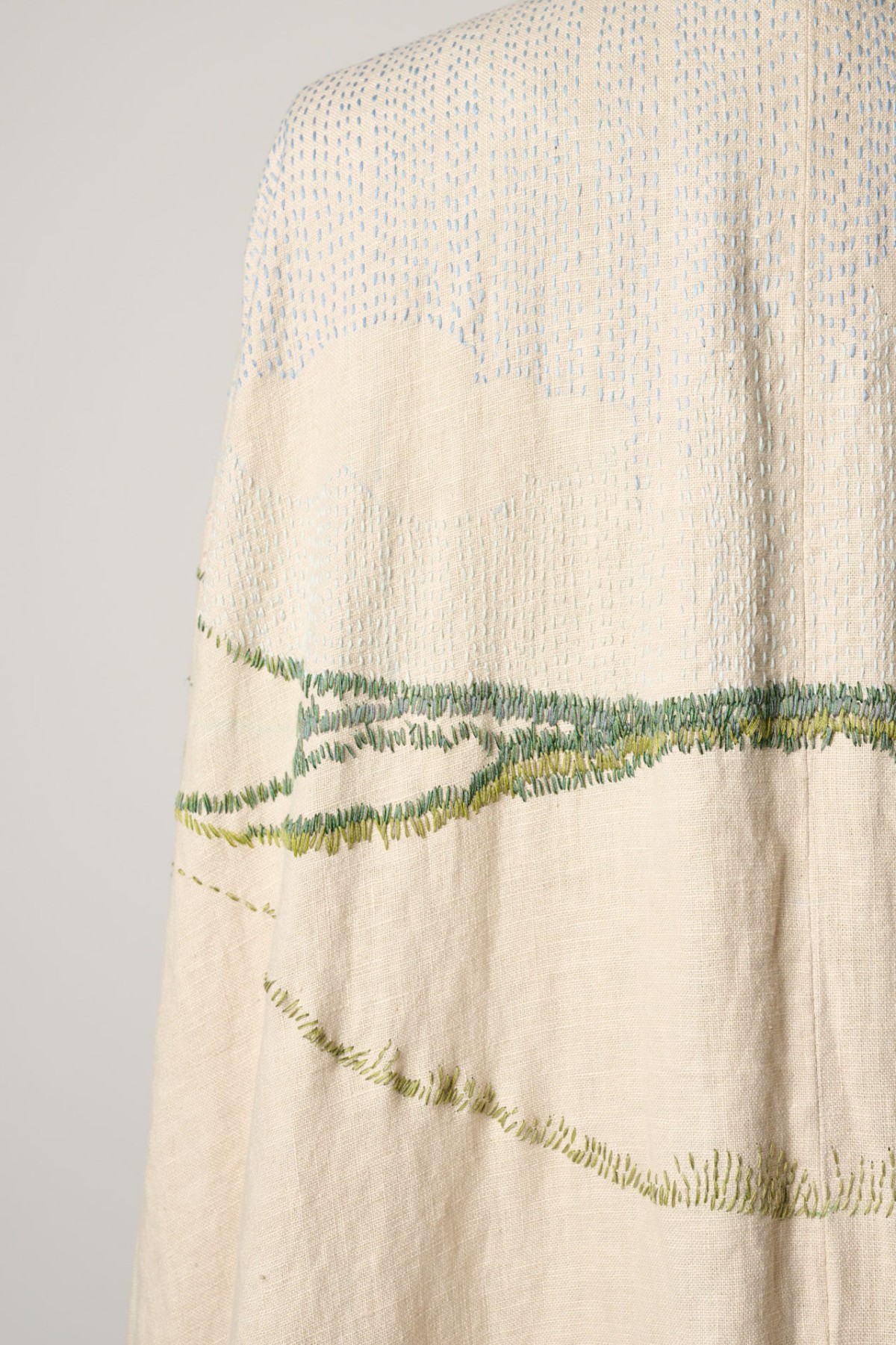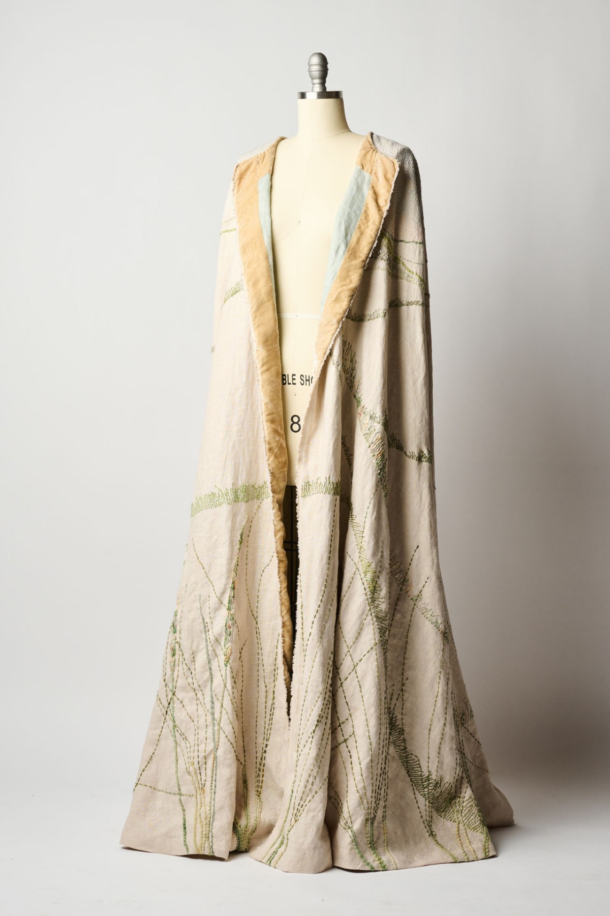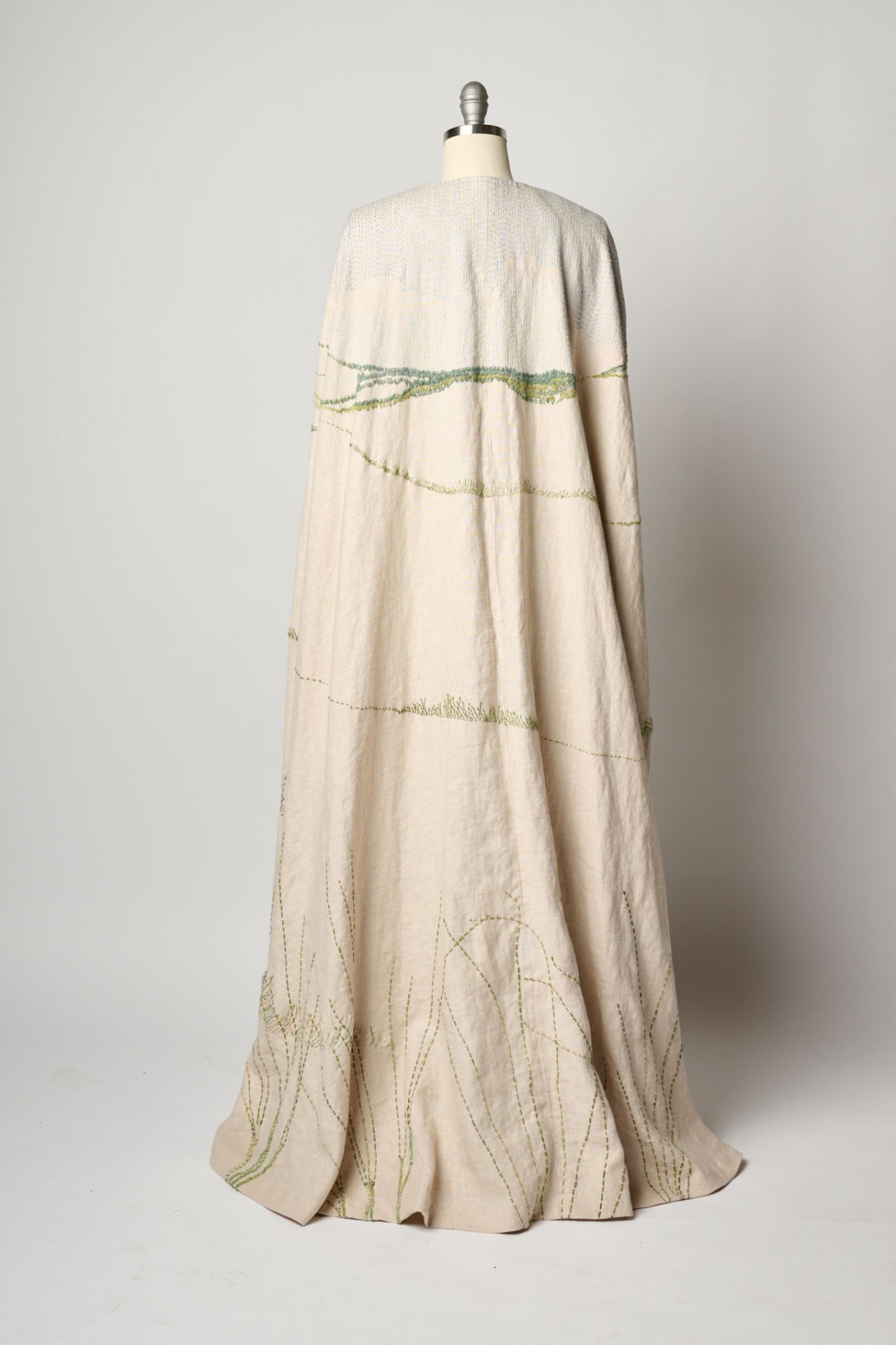 A full-length cloak meticulously embroidered with a panoramic view of the sand dunes I grew up around. I used reclaimed crystal bugle beads from my grandmother’s 1920s flapper dress to capture the light reflecting off the grass in front of her house.