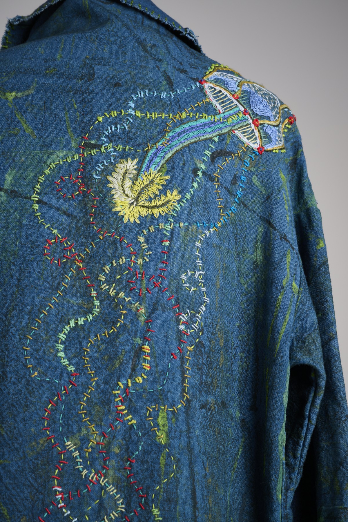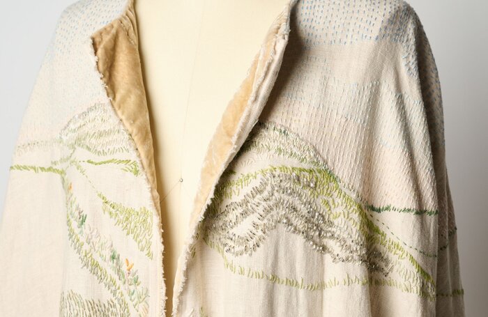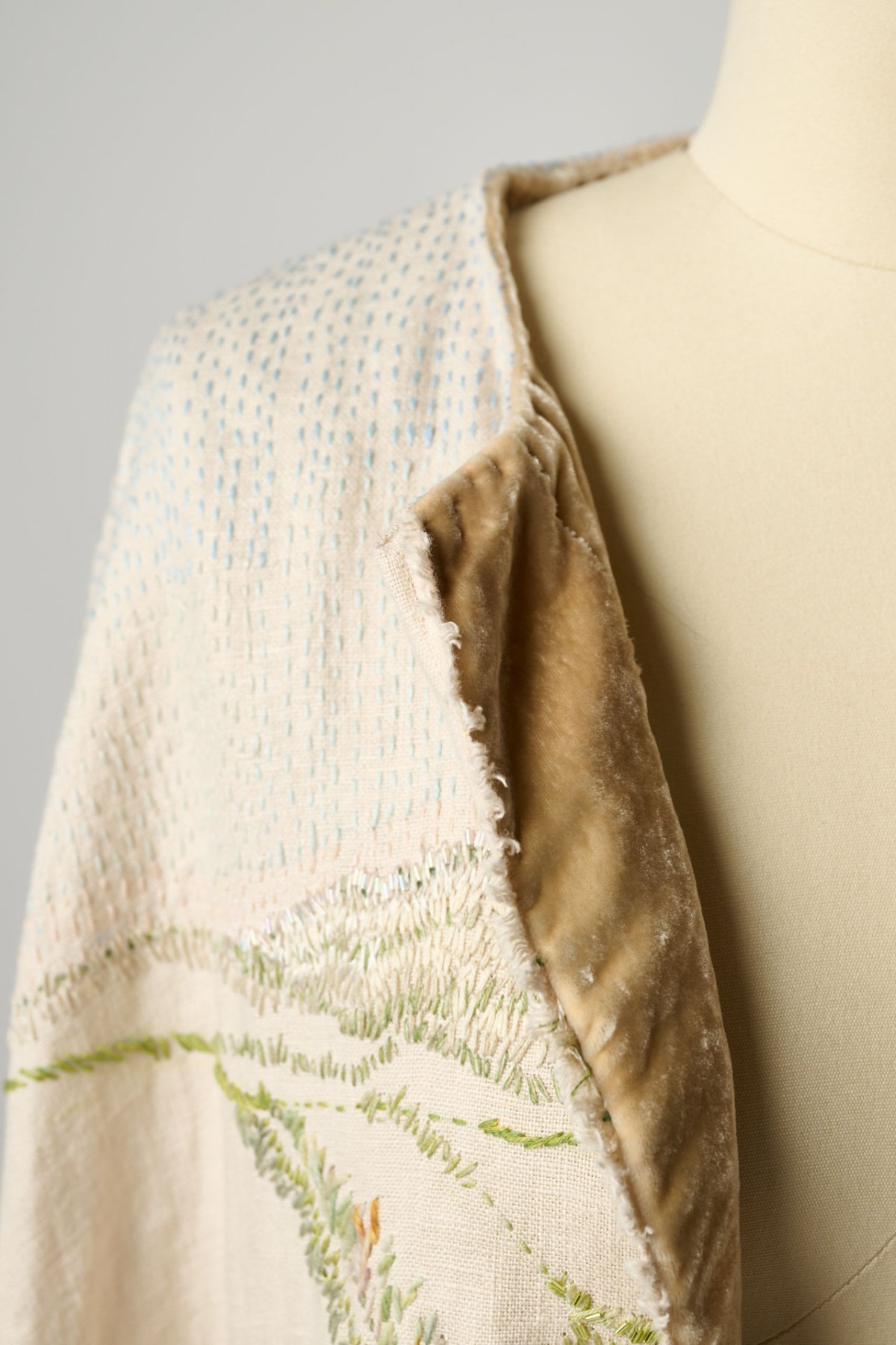 A full-length cloak meticulously embroidered with a panoramic view of the sand dunes I grew up around. I used reclaimed crystal bugle beads from my grandmother’s 1920s flapper dress to capture the light reflecting off the grass in front of her house.
