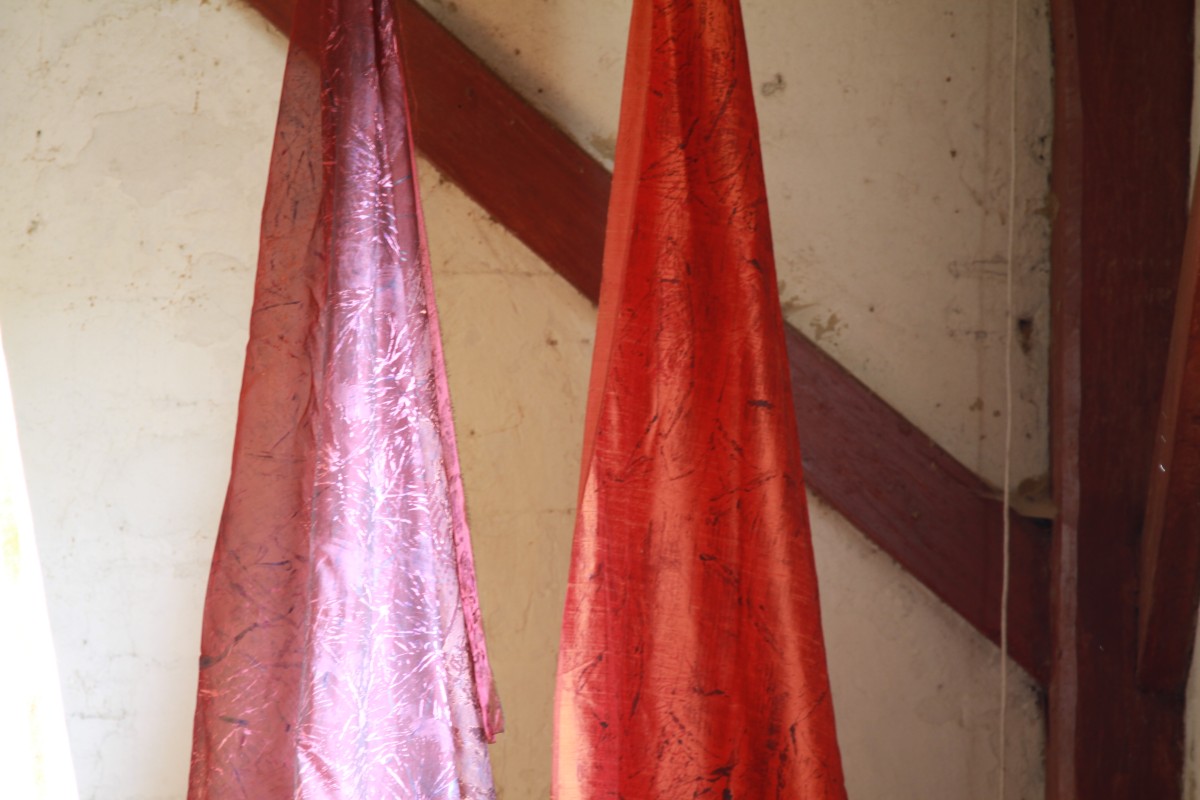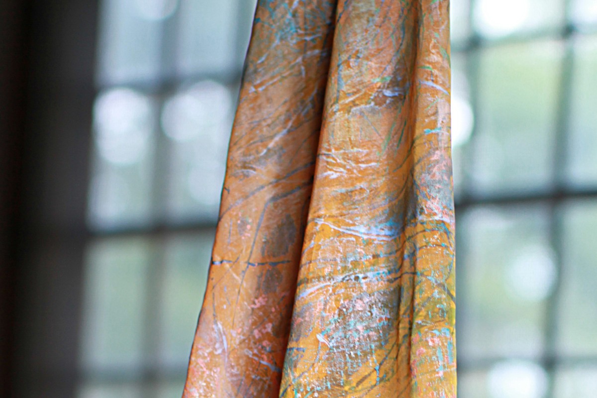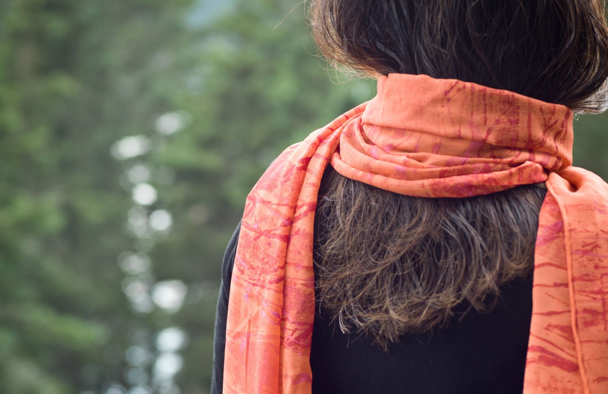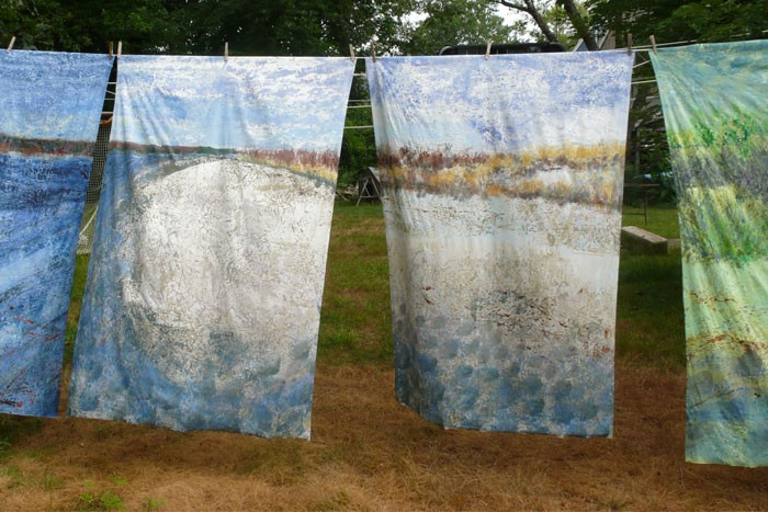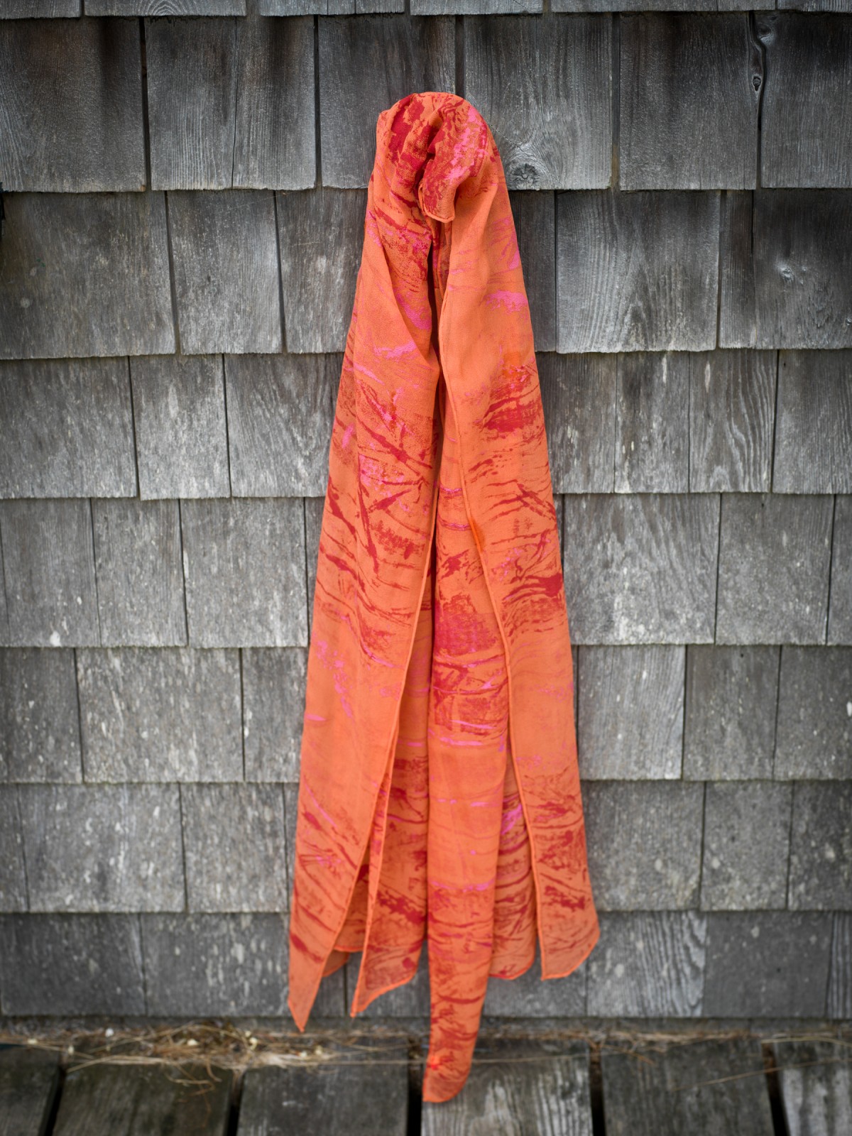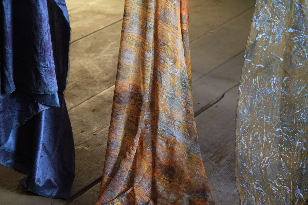 A line of hand-died scarves and clothing in silk and rayon printed with collagraph plates made with materials collected from the intertidal zone.