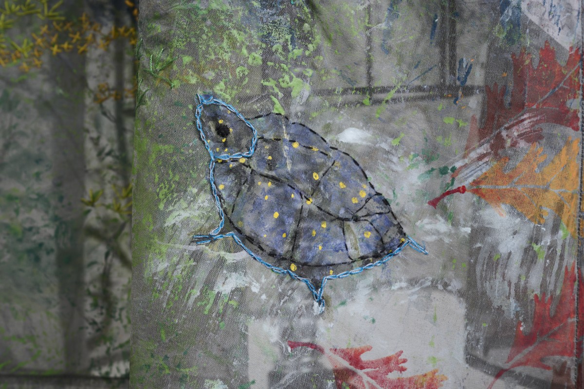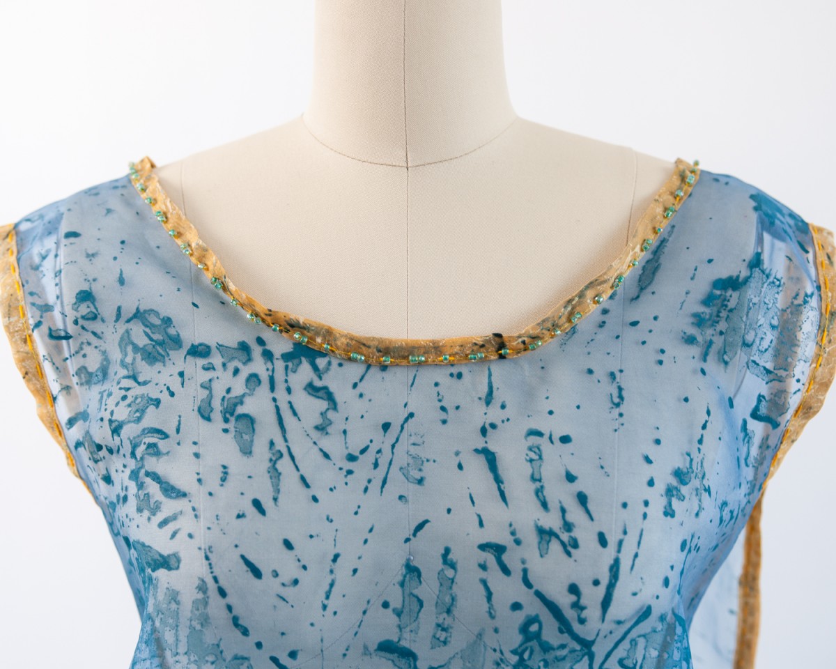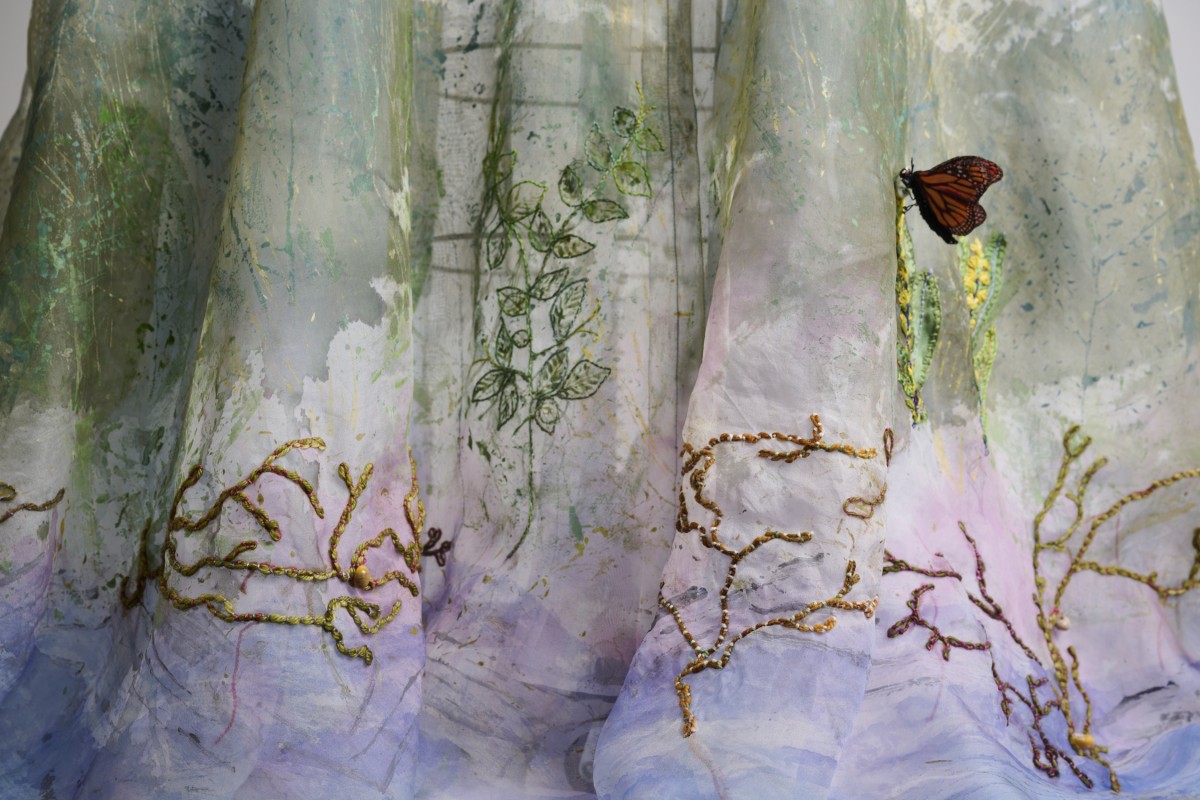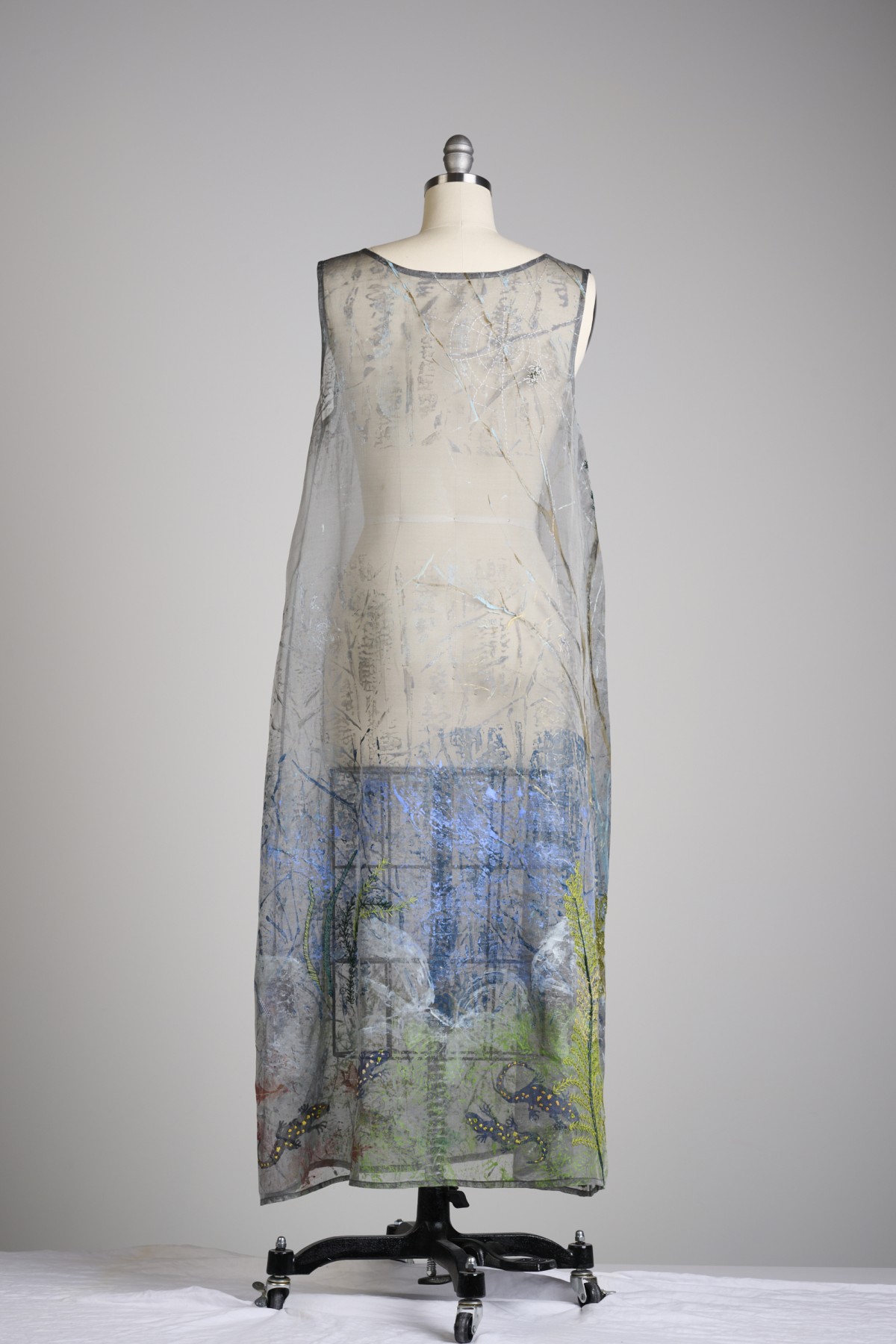 Silk organza dress. Hand-painted, printed, and embroidered with creatures from the vernal pools of Cape Ann, Massachusetts.