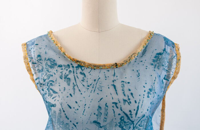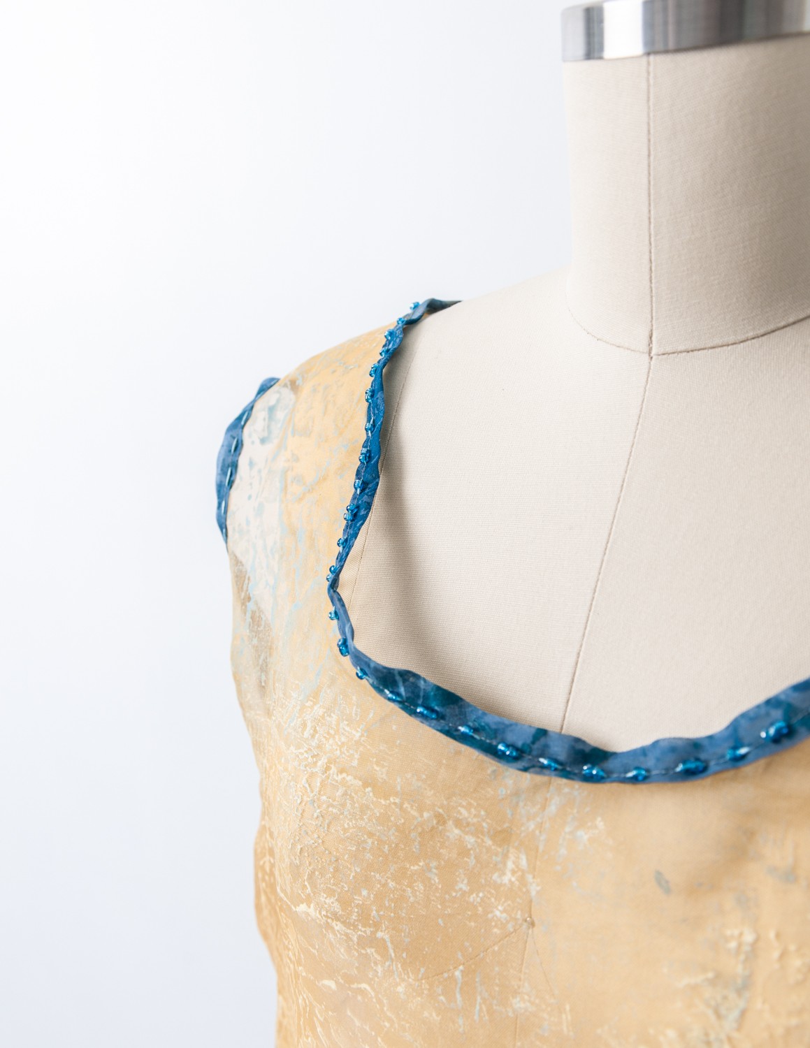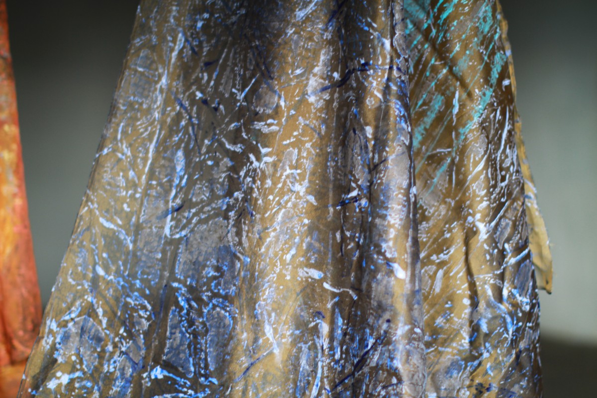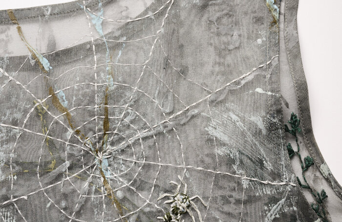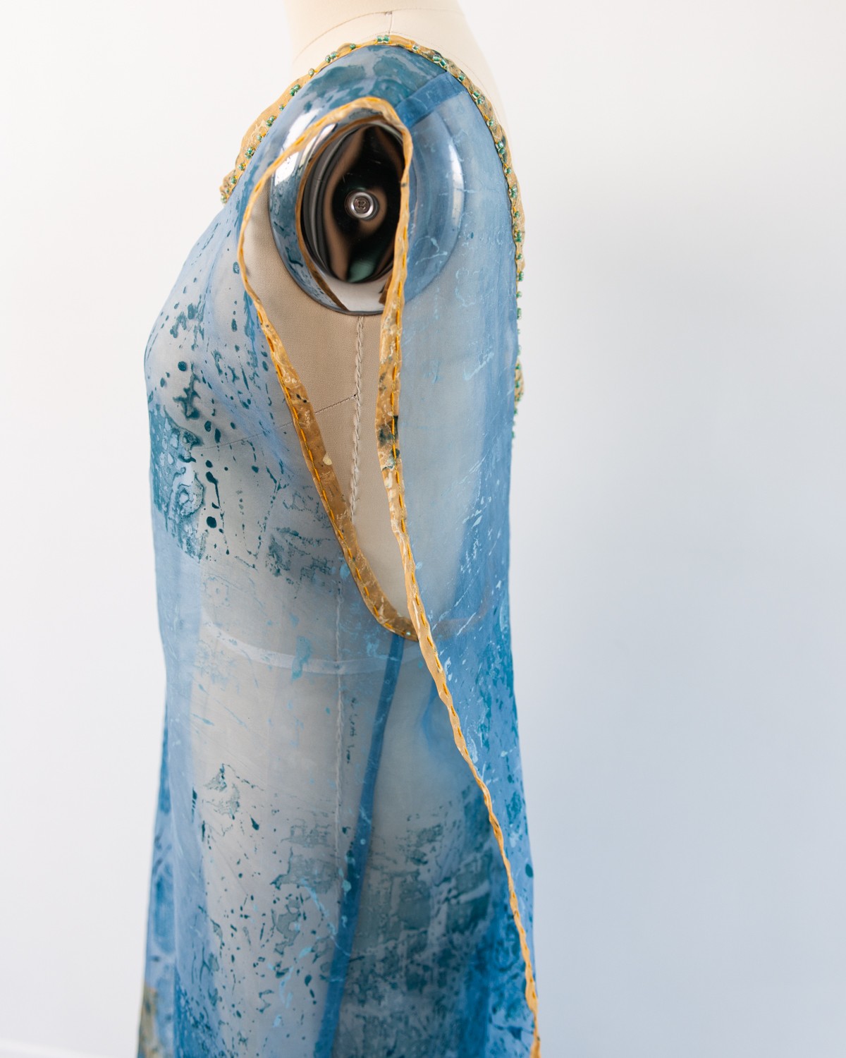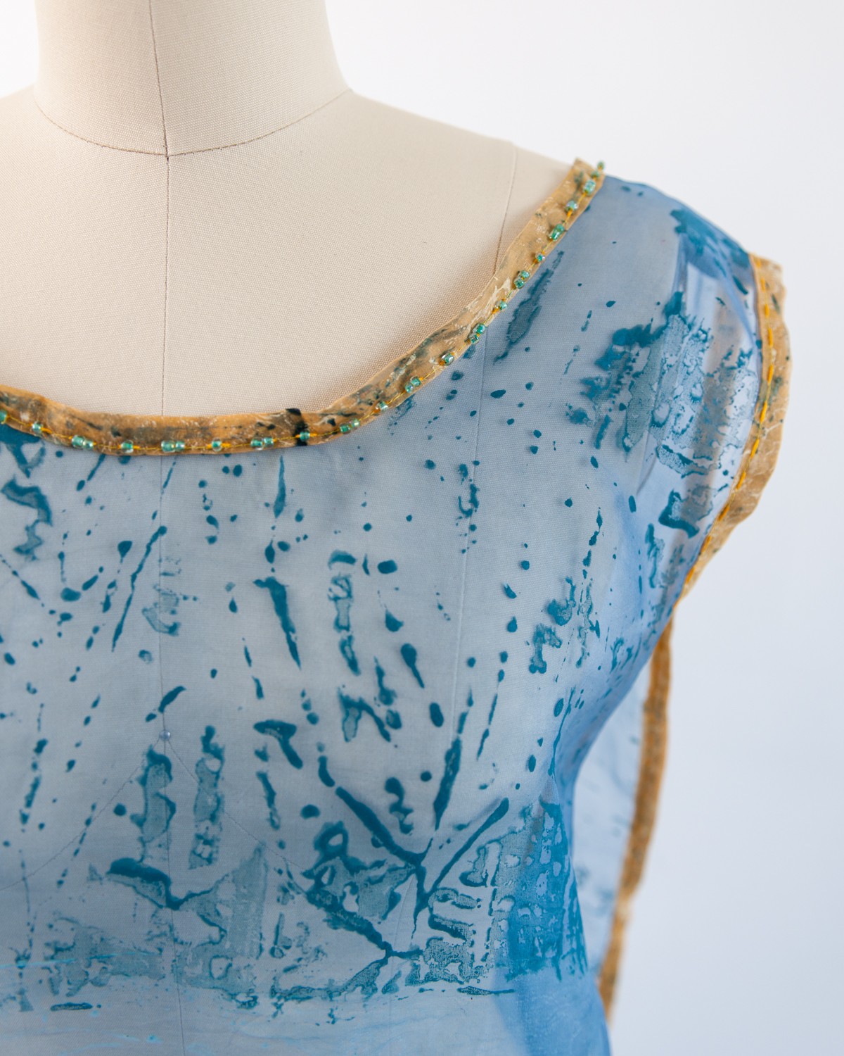 Silk organza dress. Hand-painted, printed, and embroidered with creatures from the vernal pools of Cape Ann, Massachusetts.