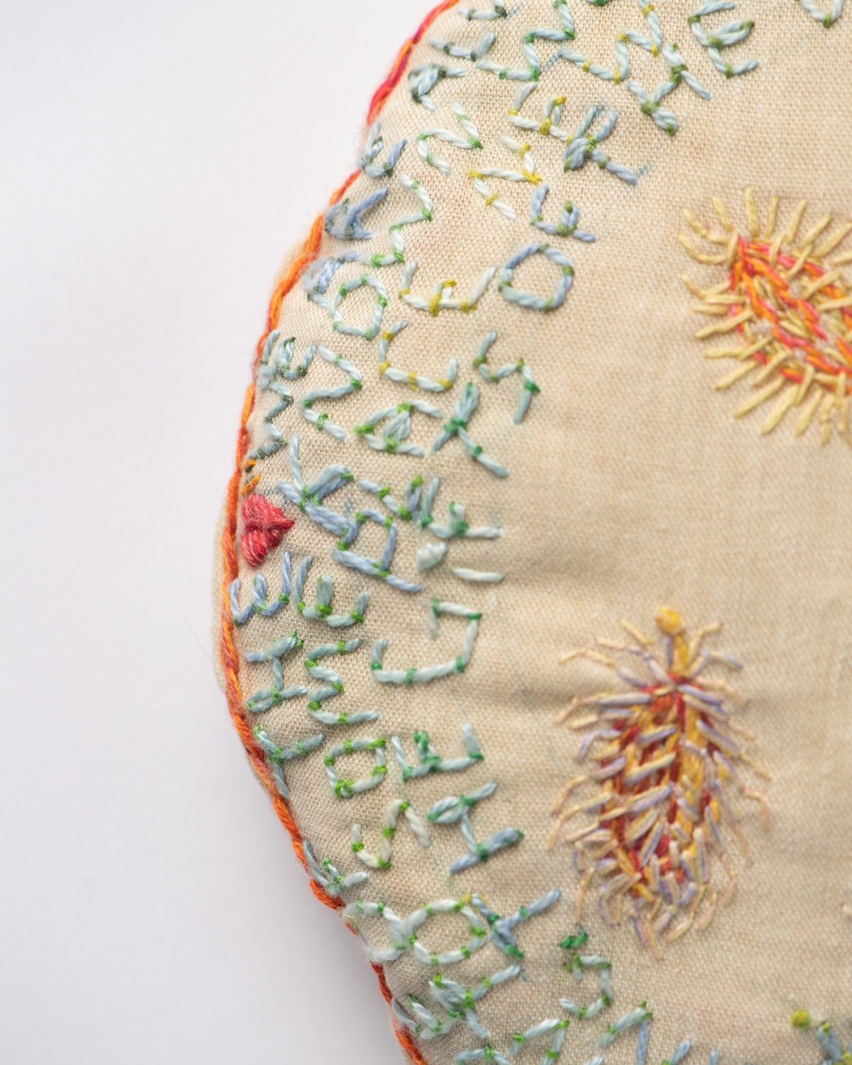A small linen pillow embroidered with a quote from Robin Wall Kimmerer and microscopic images of carrot seeds.