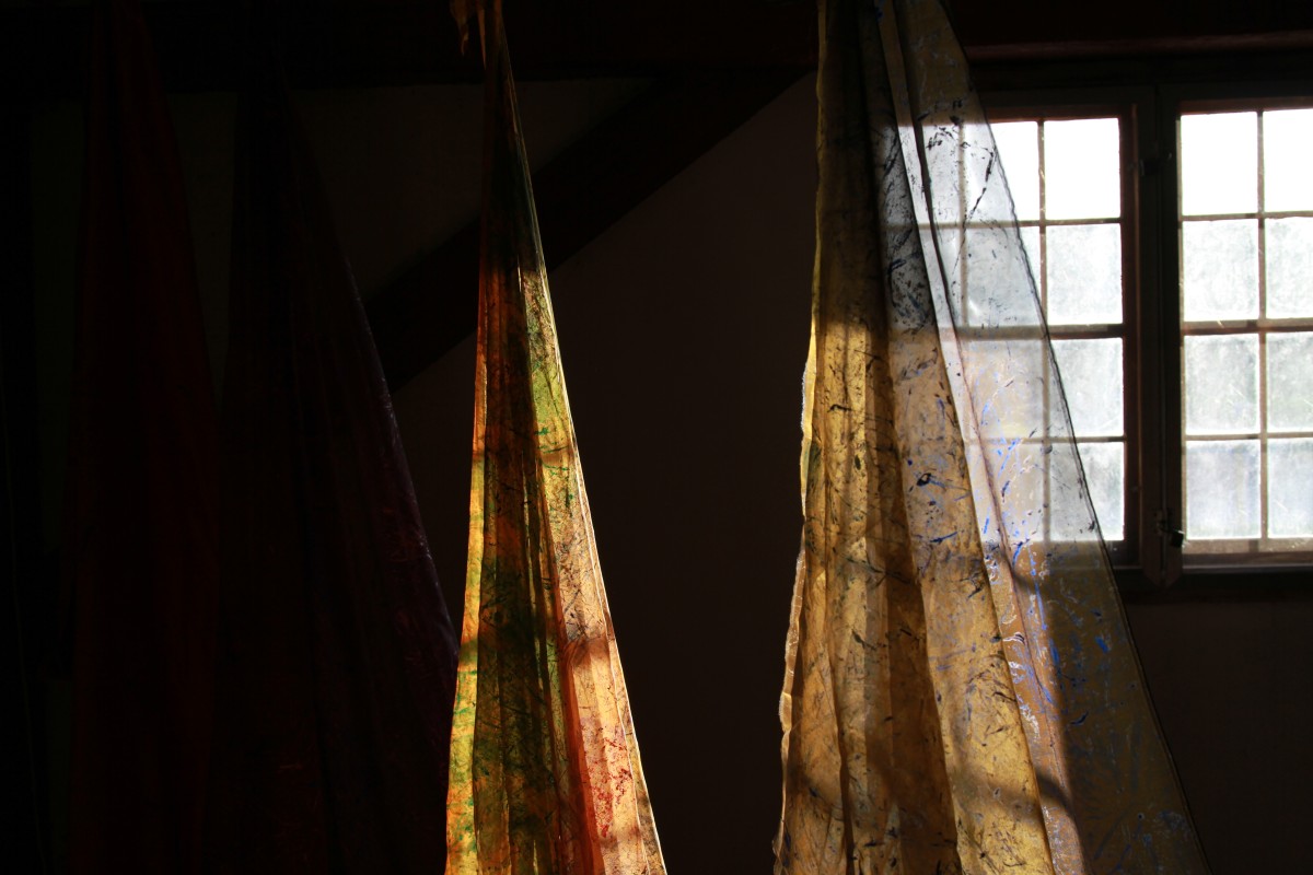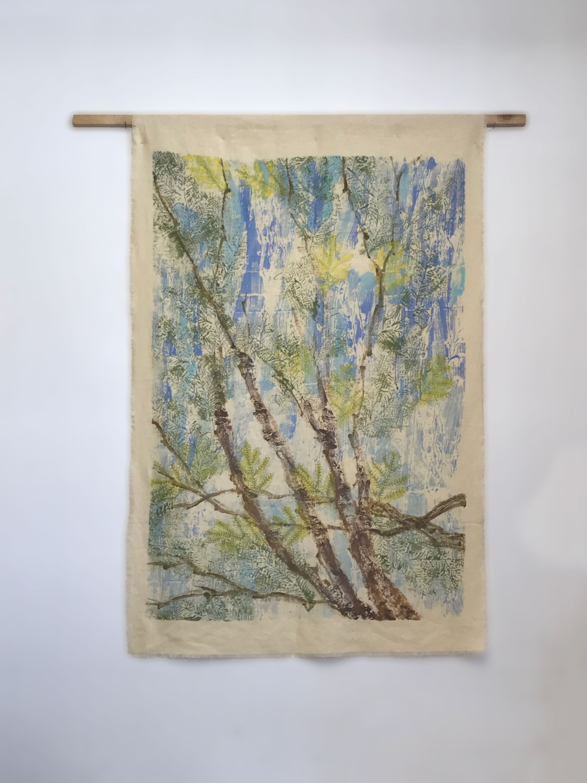 A series of hemp panels printed and embroidered with views up through the tree canopy