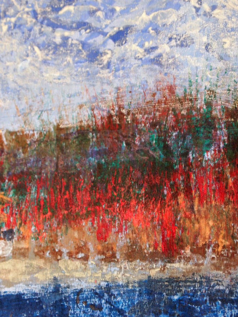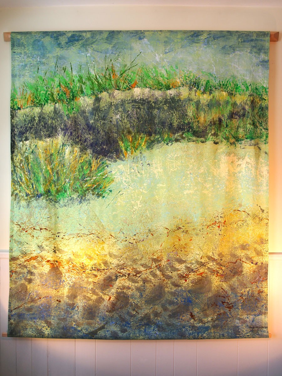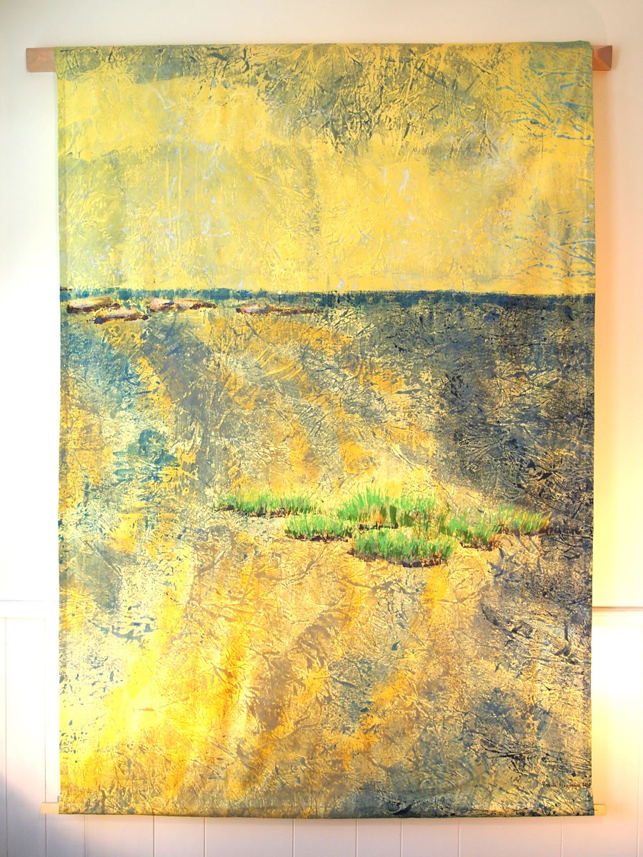 A series of silk and hemp wall panels depicting local landscapes. These large-scale works are hand-sewn and collagraph printed with plates made with gathered materials. They are studies of larger landscapes made with elements from the landscape itself — an exploration of universal shapes in nature and how they can be interchangeable.